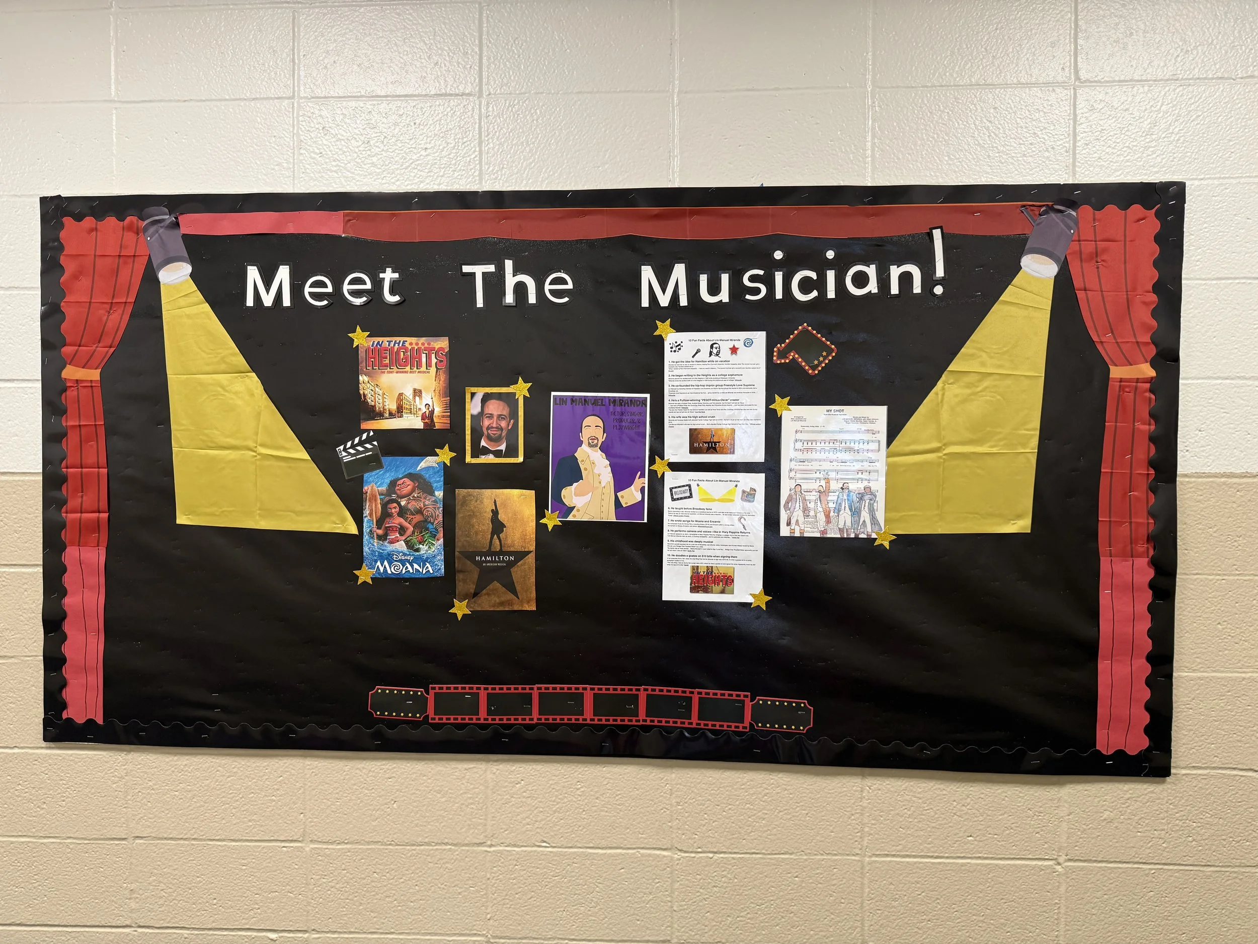 My daughter Mikayla set up the board, added “Ten Fun Facts,” and decorated it with sheet music from My Shot. She’s a huge Hamilton and Moana fan—I’m partial to In The Heights!